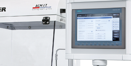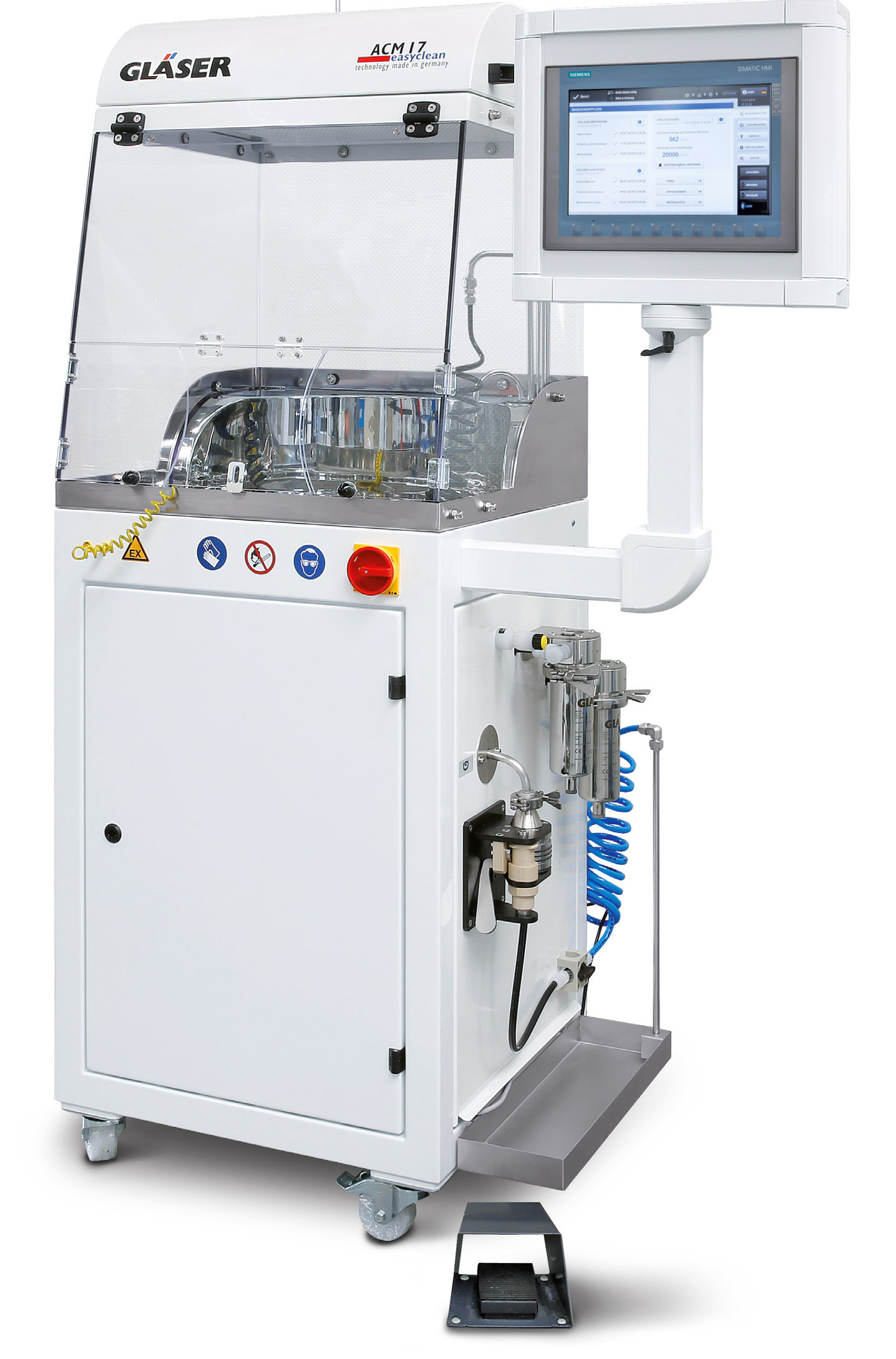 ANALYSIS AREA (500 mm) with round basin (300 mm) with polished stainless steel interior. Components from 3-5 kg can be tested with the help of a parts holder. Different extraction options: rins/spray, flood, ultrasound.
